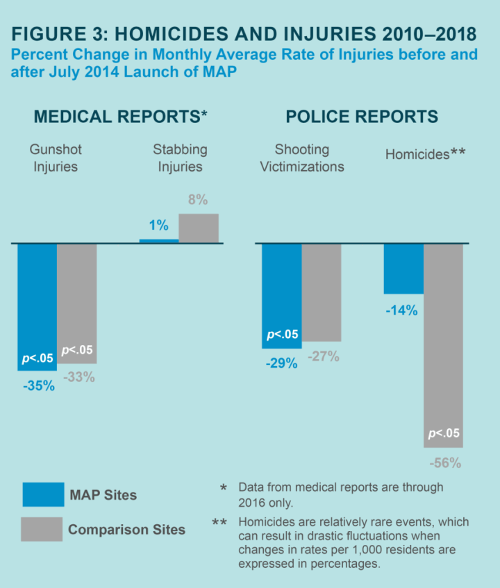 Changes in victimization outcomes also tended to be better in MAP sites (Figure 3). The average change before and after MAP was slightly better for both gunshot injuries and shooting victimizations in MAP sites. The difference in stabbing injuries favored MAP sites as well, although rates increased in both MAP and non-MAP areas (up +1% in MAP sites and up +8% in comparison sites).