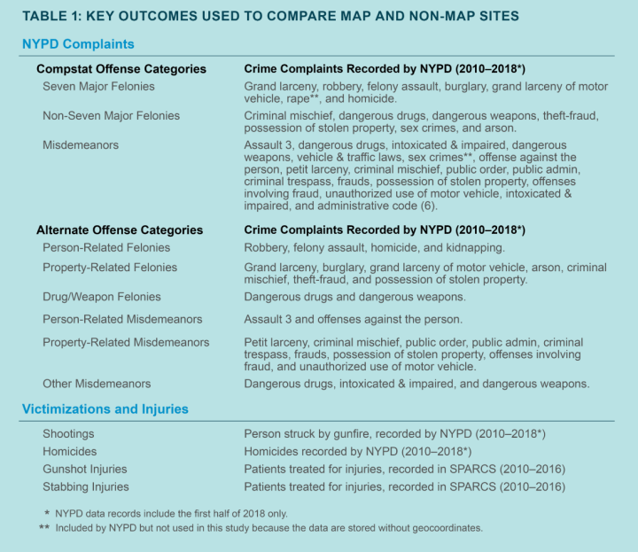 The main source of crime-related data for the MAP evaluation comes from the NYPD historical complaint data set with over six million felony, misdemeanor, and violation records from 2006 through June 2018 (updated on a quarterly basis). Most records (97%) include geographic coordinates denoting the closest mid-block location where reported incidents occurred. The availability of this rich source of point-level data allows researchers to examine crime-related outcomes across space and time.
