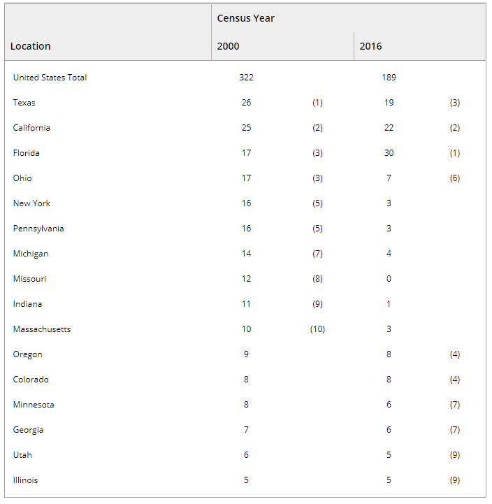 As the demand for youth confinement continued to drop, many states reduced or closed their large publicly operated institutions and relied instead on private facilities and facilities operated by local governments, including detention centers originally designed to house youth during court proceedings and those awaiting long-term placements. According to the federal census of juvenile residential facilities, the number of public facilities declined significantly after the 1990s (Puzzanchera et al., 2018). In 2000, there were 322 long-term secure facilities for adjudicated youth. By 2016, there were just 189 such facilities nationwide, indicating that 133 facilities had been closed or reclassified into something other than long-term secure institutions (Table 1). Most of the nation’s long-term secure facilities for youth were in just 10 states in 2016: Florida (30 facilities); California (22); Texas (19); Oregon (8); Colorado (8); Ohio (7); Georgia (6); Minnesota (6); Illinois (5); and, Utah (5). Only Florida reported more long-term secure facilities in 2016 than in 2000 (30 vs. 17). The other top-10 states in 2000 reported fewer long-term facilities in 2016.