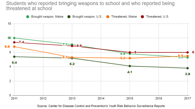 While Maine students were more likely to bring a weapon to school than their counterparts in the rest of the nation, they were slightly less likely to feel threatened by weapons on campus.