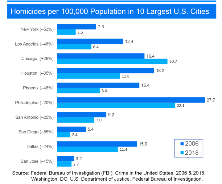 Most large American cities experienced falling violent crime rates in recent decades. New York City was second only to San Diego in the scale of its decline. The murder rate in New York fell 53 percent between 2006 and 2018 (the most recent year with complete FBI data).