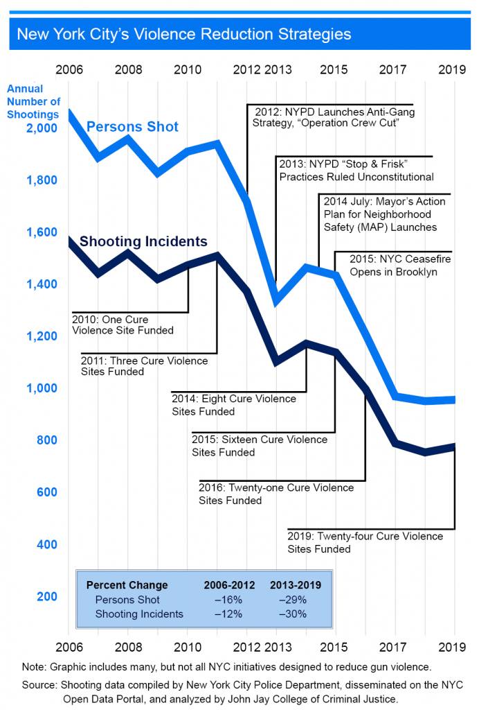 How did this happen? It is not possible to attribute such changes to one or two factors alone, but New York City launched an array of initiatives since 2010, expanding investments in communities and providing new support for the most disadvantaged and marginalized neighborhoods of the city. The Cure Violence model came to New York in 2010 and by 2019 programs were operating in 24 areas. Officials launched the Mayor’s Action for Neighborhood Safety in 2014 and the program now operates in 15 public housing communities across all five boroughs of the City.