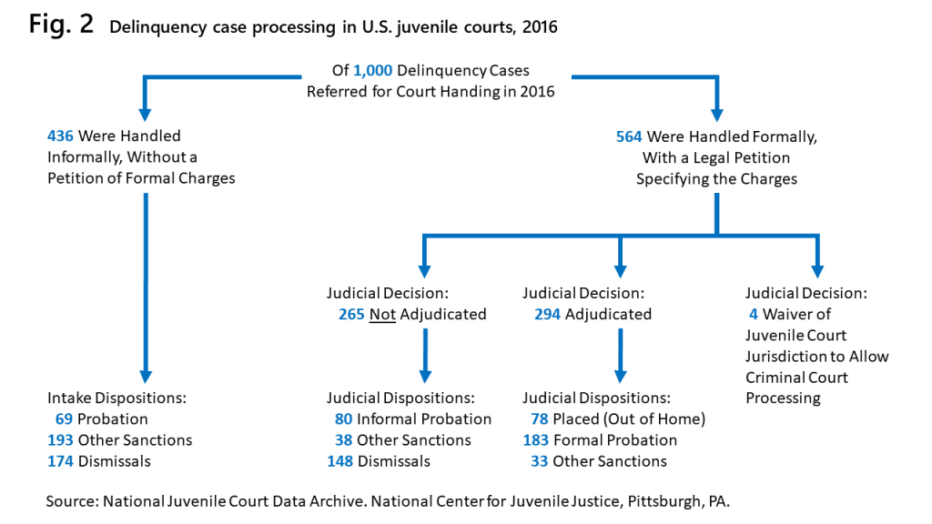 If the court proceeding does not result in adjudication (similar to acquittal), the petition might be dismissed and the matter could be considered closed. Even without adjudication, however, a case could be “continued” in contemplation of dismissal. In such a proceeding, the court may ask the youth to comply voluntarily with a program of alternative sanctions, such as paying restitution or attending drug counseling. The charges would be pending, and then possibly dismissed after the youth completed the services and sanctions suggested by the court. National juvenile court statistics suggest that more than 40 percent of non-adjudicated delinquency cases involve at least some type of informal services and sanctions (OJJDP, 2018).