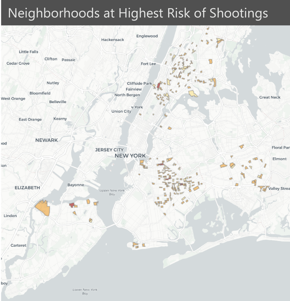 To identify areas of New York City experiencing disproportionate shootings, researchers aggregated shooting data by Census Block Groups (CBG). According to the Census Bureau, CBGs are statistical divisions of census tracts, generally containing between 600 and 3,000 people. There are 6,587 CBGs in New York City, not including water areas.
