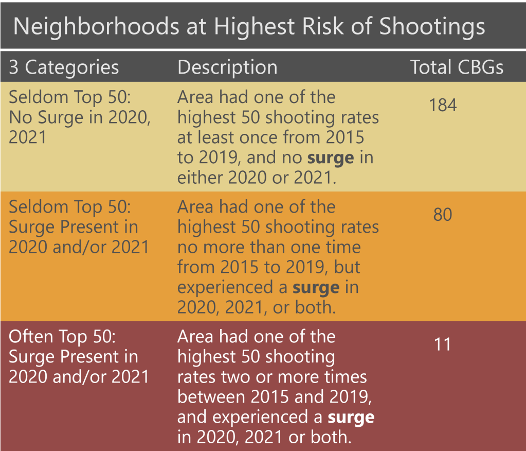 The number of shootings reported in each census block group was divided over the 2020 population to create yearly rates of shooting incidents per 1,000 population. Researchers ranked all CBGs based on their rates of shooting incidents and identified the 50 CBGs with the highest rates in each year from 2015 to 2021. All city neighborhoods appearing in the list of 50 highest shooting rates at least once during those seven years were placed into one of three categories.