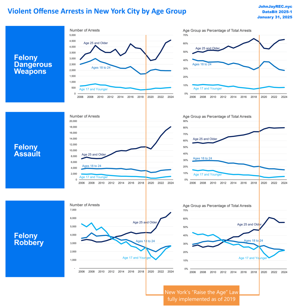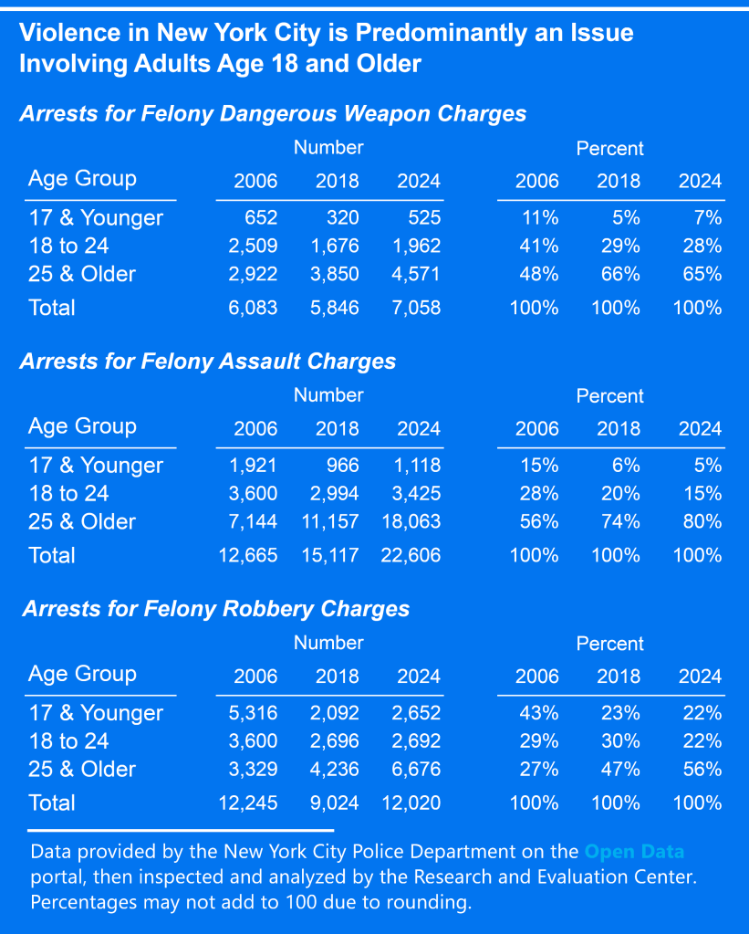 If recent changes in crime were due to changes in the legal handling of youth under 18, marked age-specific patterns would be observable. Such effects are not found in arrest data from New York City. Thus, it does not appear to be accurate to attribute recent increases in violent crime to the State law known as “Raise the Age.”