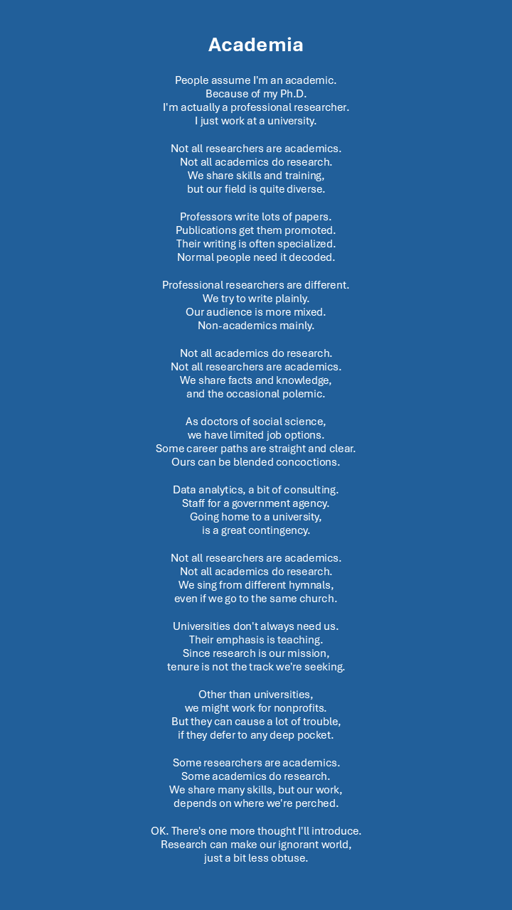 “Academia” — Most of my career has been in research, but I don’t call myself an academic. I never wanted to fit the academic model. I always thought research should be practical, freely accessible, and understandable for non-academic audiences. (Lyrics) |