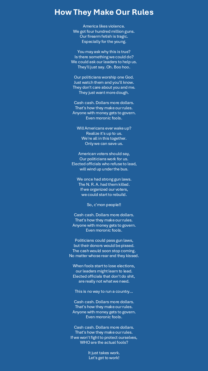 “How They Make Our Rules” — The firearm violence rate in the U.S. is a stain on our international reputation. It doesn’t have to be this way, but we’ll have to reduce the influence of fools and their money on our political system. (Lyrics) |