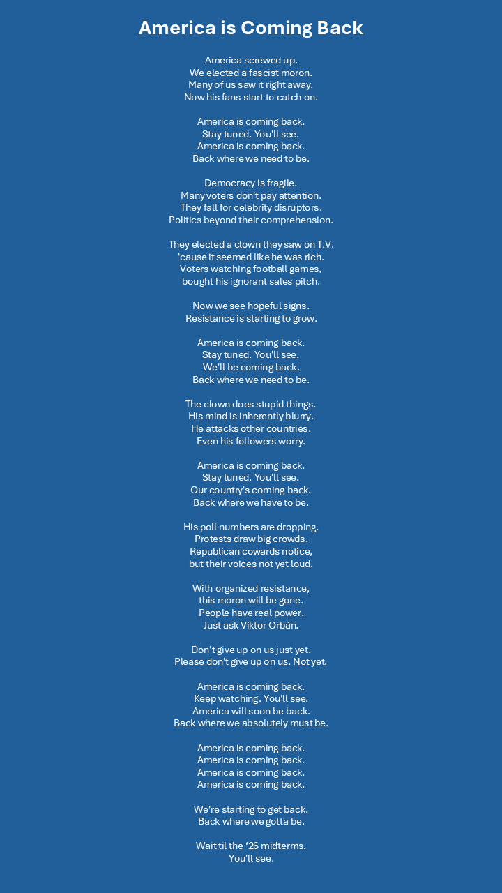 “America’s Coming Back” — It is still possible to feel optimistic about the future of America. Resistance to authoritarianism rebounded in the moron’s second term, as he was making more obvious mistakes. Some so transparent that even Republicans saw them. (Lyrics) |