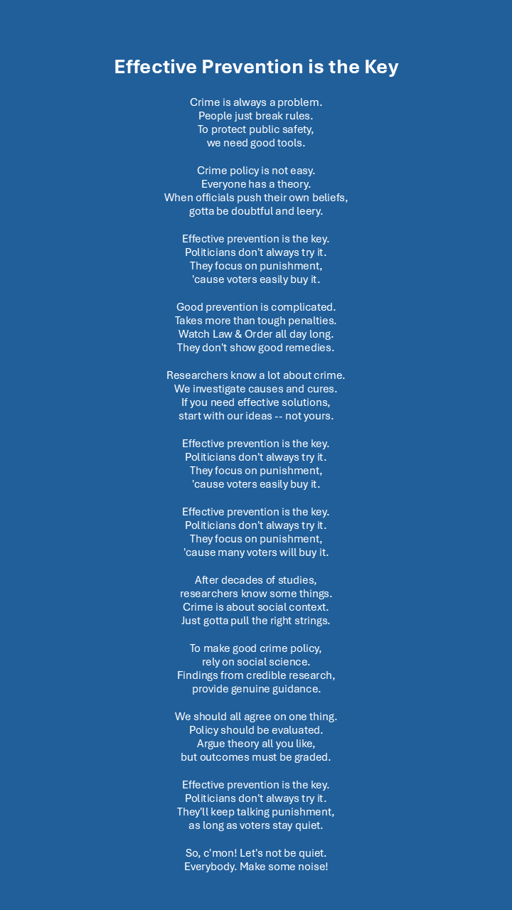 “Effective Prevention is the Key” — I spend my days thinking about the effectiveness of crime prevention strategies. I wish lawmakers would get serious about it, and not just make up stuff for their campaigns. (Lyrics) |