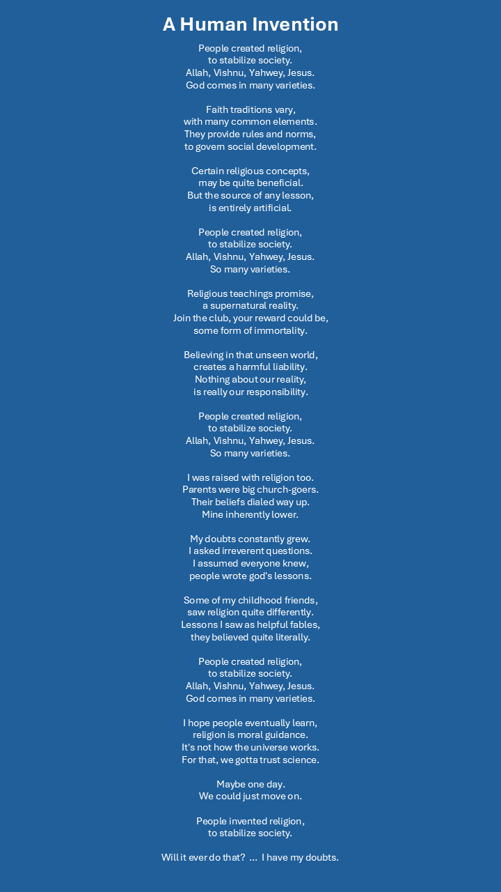“People Invented Religion” — I cherish the values I learned from my parents as they exposed me to their religious faith. But people who take religious stories literally make me worry about humanity’s future. (Lyrics) |